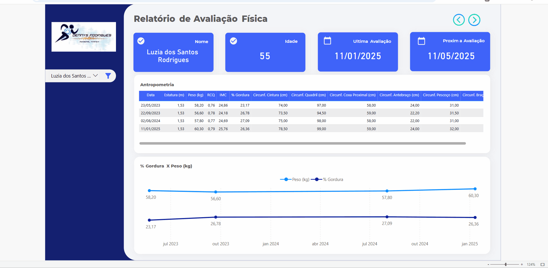 Criei um painel no Power BI para visualizar e monitorar indicadores físicos de alunos de corrida e musculação. O relatório inclui métricas como estatura, peso, IMC, percentual de gordura e circunferências corporais, além de datas de avaliação. Com gráficos intuitivos, o painel permite acompanhar a evolução dos alunos e apoiar decisões para melhorar desempenho e resultados.